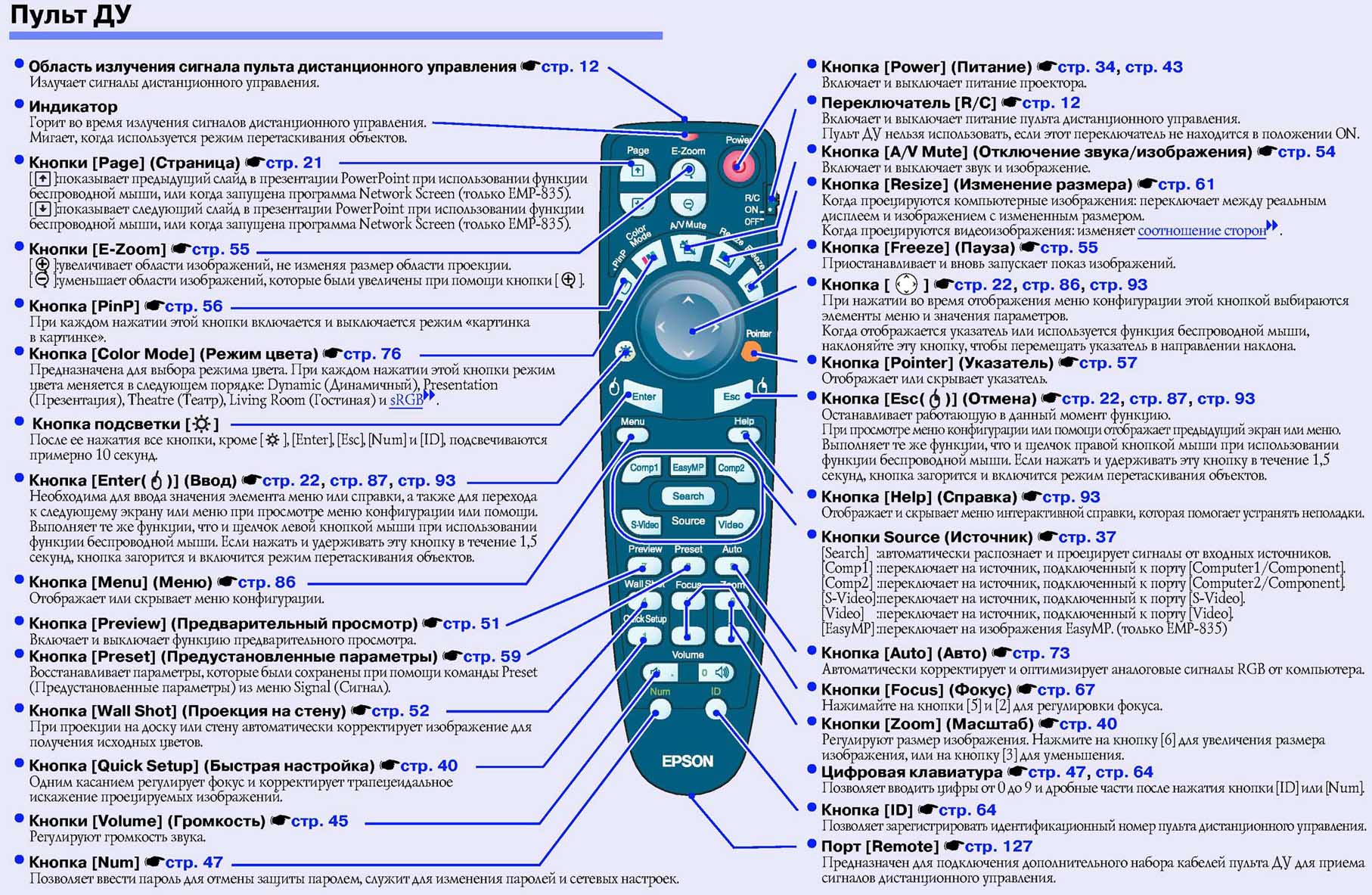 | R/C (On / Off); Page Up / Page Down; E-Zoom + / E-Zoom -; Pointer (On / Off); Підсвітки клавіатури; Джойстик; Enter; Esc. |